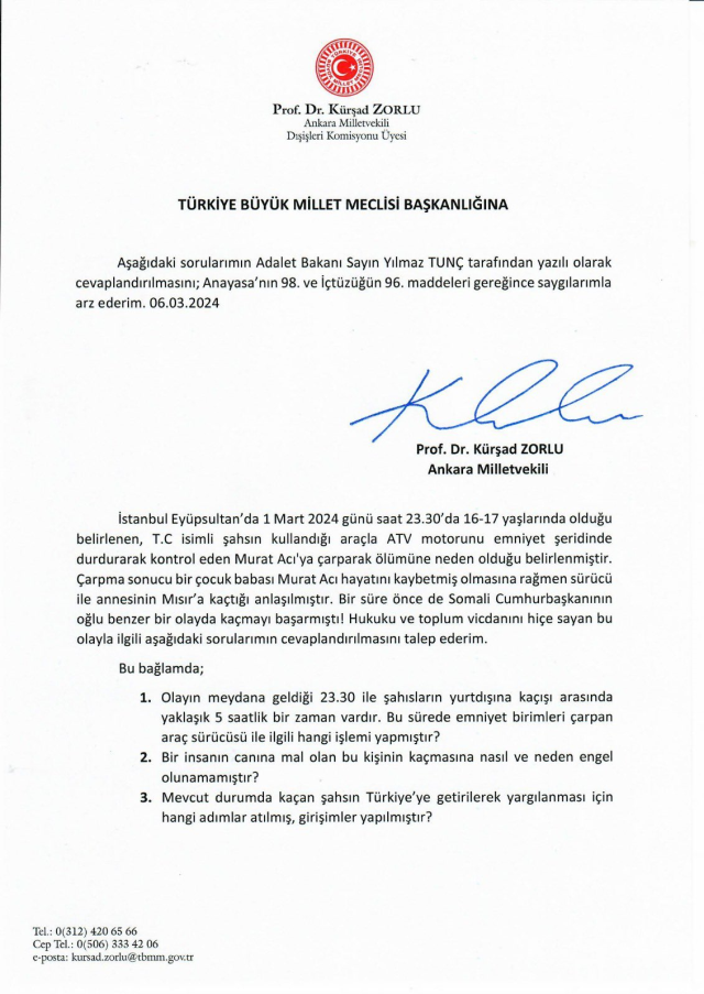 Zorlu’nun paylaştığı soru önergesinde ise şu ifadeler yer aldı; “İstanbul Eyüpsultan’da 1 Mart 2024 günü saat 23.30’da 16-17 yaşlarında olduğu belirlenen, T.0 isimli şahsın kullandığı araçla ATV motorunu emniyet şeridinde durdurarak kontrol eden Murat Arıcı’ya çarparak ölümüne neden olduğu belirlenmiştir. Çarpma sonucu bir çocuk babası Murat Arıcı hayatını kaybetmiş olmasına rağmen sürücü ile annesinin Mısır’a kaçtığı anlaşılmıştır. Bir süre önce de Somali Cumhurbaşkanının oğlu benzer bir olayda kaçmayı başarmıştı! Hukuku ve toplum vicdanın] hiçe sayan bu olayla ilgili aşağıdaki sorularımın cevaplandırılmasını talep ederim.